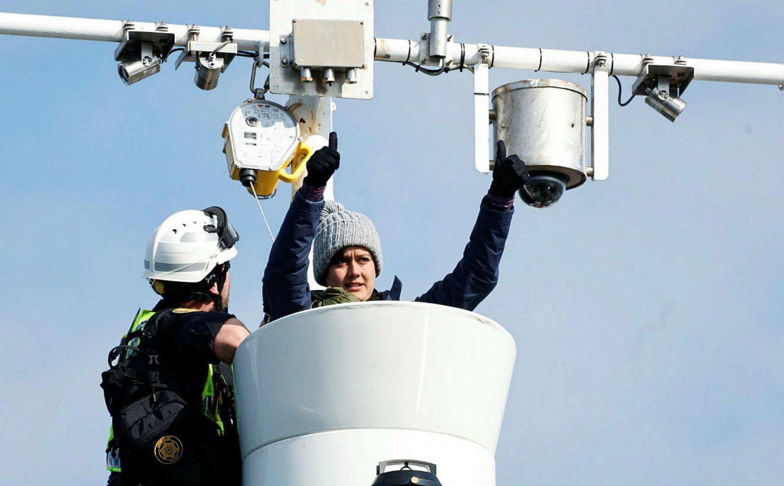 The police confiscated Babaei’s food, water, and medicine almost immediately. When they tried to remove her from her barrel by force, they cut her lip. Phillips, still in her own crow’s nest, watched and could do nothing. She spent the remaining hours feeling guilty that she still had sips of water and cereal bars. At one point, she tried to throw snacks across to Babaei. She missed. The attempt was captured on a livestream that Icelandic television broadcast continuously throughout the occupation.