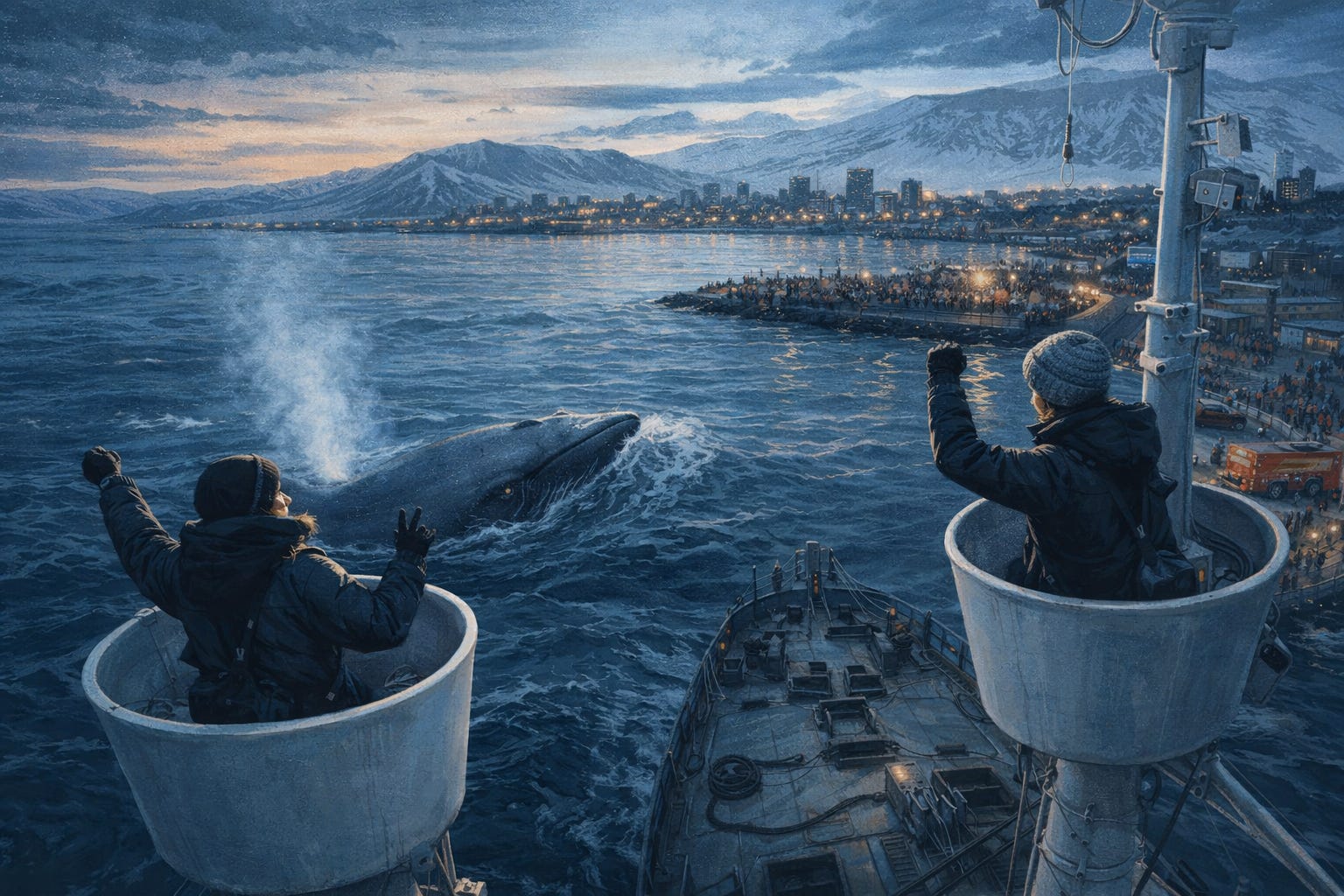 I think about the fin whale I watched off the coast of Reykjavik. The way it surfaced without urgency, breathed, and slipped back under. It didn’t know about the ships in the harbour. It didn’t know about the trial, or the recordings, or the men trading favours in government buildings. It didn’t know that two women climbed frozen masts in the dark for it.