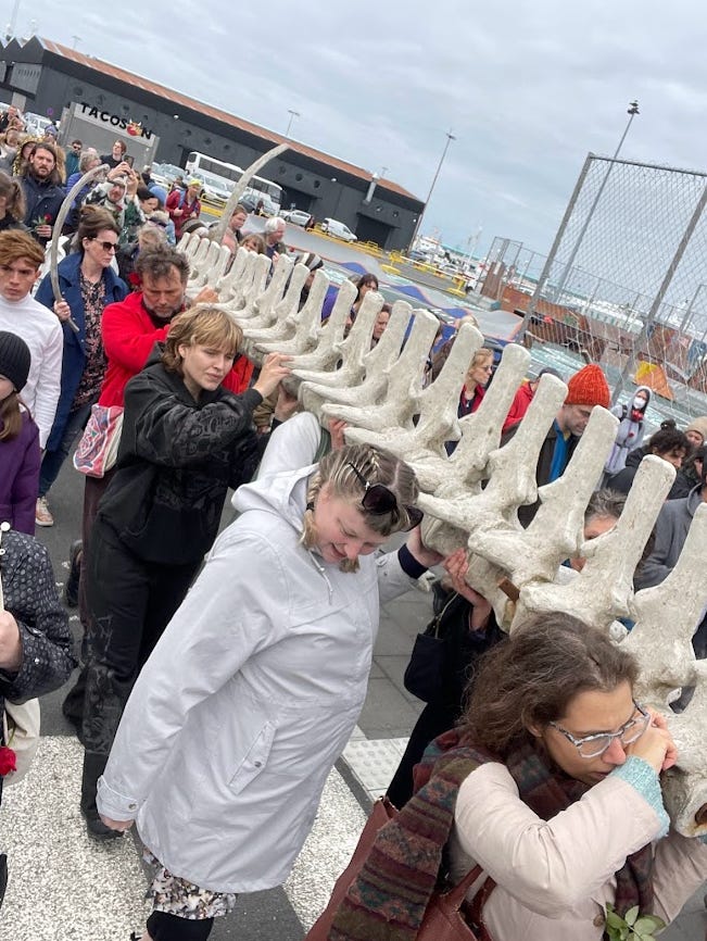 It was the summer of 2023, in Reykjavik harbour. Whale bones had been laid on the dock next to H8 and H9, the ships that had killed them. She was performing yes, but she was also mourning.