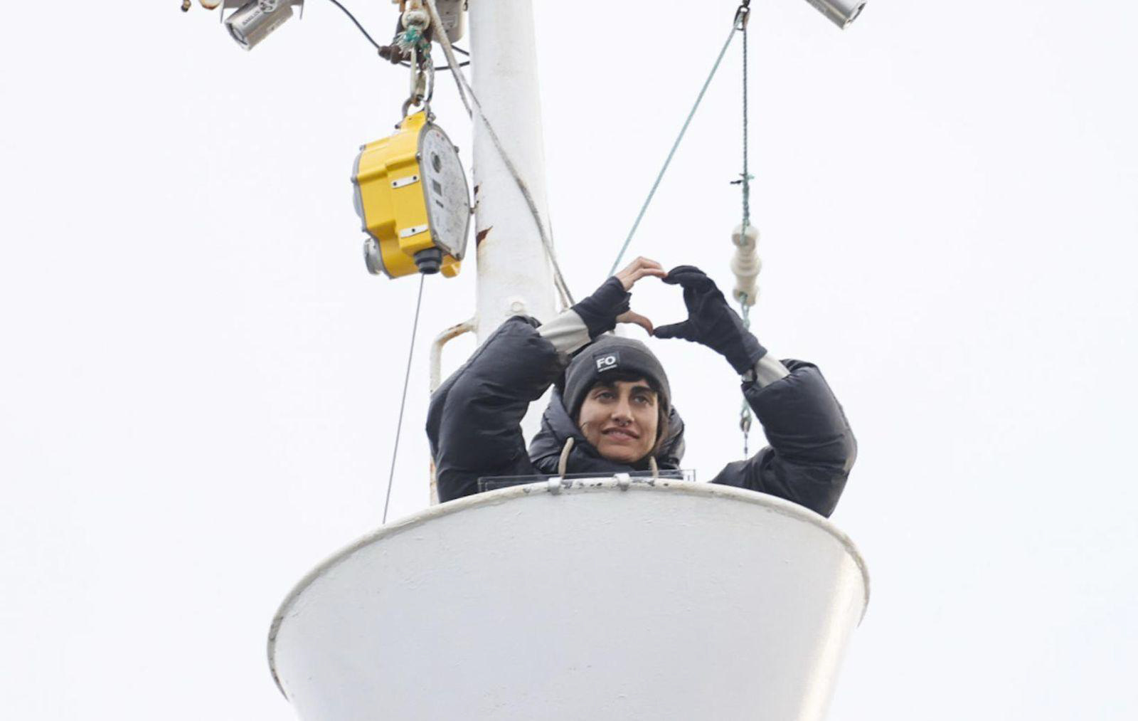The response from the public was extraordinary. People came to the harbour with food, water, and supplies, which the police confiscated. Someone tried to order supplies for Babaei via drone. The delivery platform Aha had to issue a public service announcement: their website had crashed, and they couldn’t deliver anyway because the ships were under the flight path. A small crowd stayed through the night, playing the activists’ favourite songs into the darkness through a sound system. Someone read messages of support from their families. A swimmer braved the freezing harbour to shout encouragement up to them. On a small boat nearby, a pro-whaling protester held a sign telling them to go home.