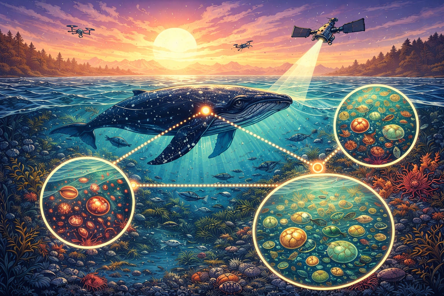 Around half of global photosynthetic oxygen production happens in the ocean, and phytoplankton do most of it. They also form the base of marine food webs. Phytoplankton feed zooplankton. Zooplankton feed krill. Krill feed whales. Cut the base of that chain and everything above it starves.