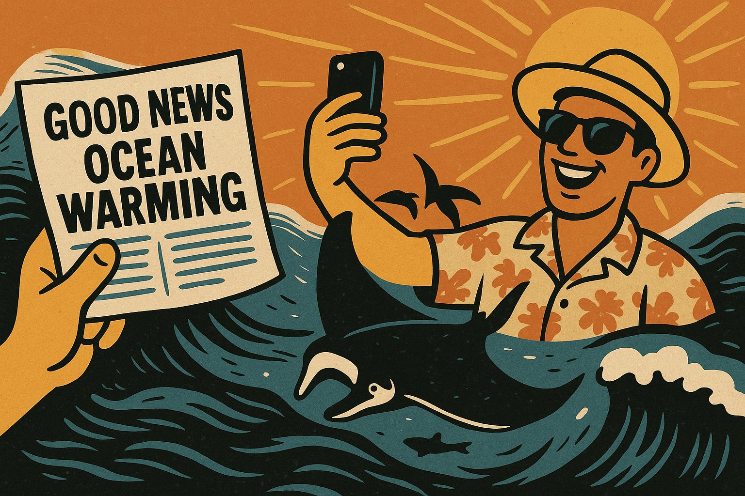 We are watching generations of species pushed into unfamiliar timelines. Entire ecosystems are reprogramming themselves in real time, yet the headline takeaway is: Great news. More time to swim with manta rays.