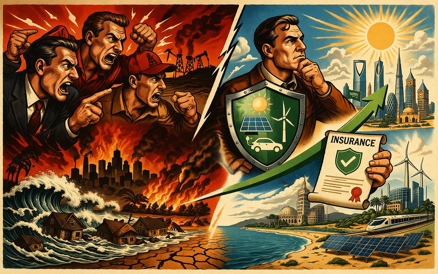 Here’s what makes this stranger still. The countries most economically dependent on fossil fuels, the ones with the most to lose from a global energy transition, are already hedging. Saudi Arabia has spent the last decade building out tourism, finance, and technology investment through Vision 2030. The UAE is positioning itself as a hub for everything that isn’t oil. These are not the actions of governments confident that the current model lasts forever. They are reading the same future the climate scientists are reading, and quietly buying the insurance policy, while their exports fund the politicians loudest about drilling more of it.