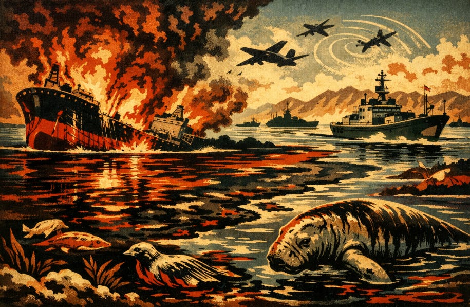 On 17 June last year, two oil tankers collided in the Persian Gulf. The vessel ADALYNN caught fire. An 8-kilometre oil slick spread across the water. Nobody ordered that spill. Nobody aimed at the sea. Investigators believe GPS spoofing, a form of electronic interference common in active conflict zones, may have contributed to the collision. Whether or not it did, the incident illustrated something the sea cannot explain away: when a body of water becomes a military corridor, accidents become more likely, and clean-up becomes less possible.