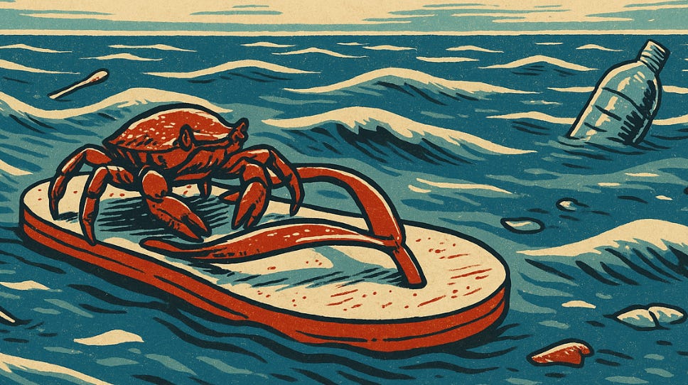 Somewhere in the Pacific, a crab scuttles across a sun-bleached flip-flop. The foam is cracked and worn, shaped by salt and time. To the crab, it’s shelter. To the ocean, it’s structure. To us, it should be a mirror.
